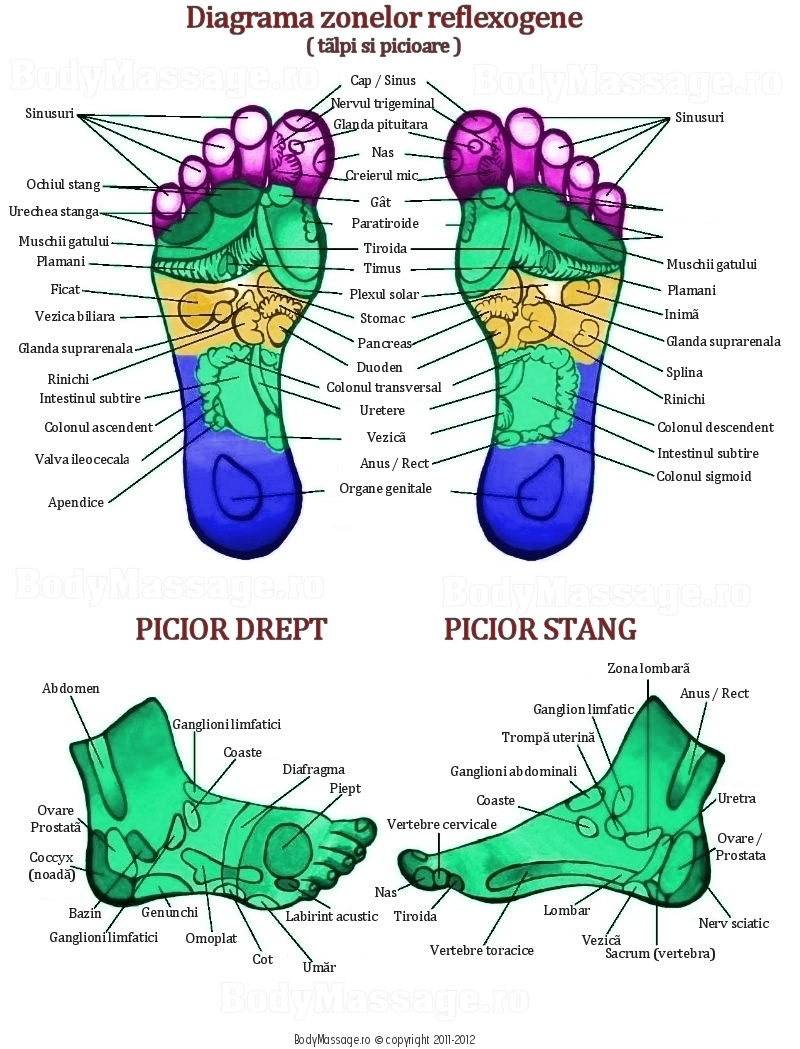 Talpa piciorului – una dintre zonele in care se afla cele mai multe puncte reflexe – este de fapt o harta a intregului corp. Creierul, ochii, urechile, glanda tiroida, plamanii, ficatul, stomacul, pancreasul, duodenul, rinichii, vezica urinara, colonul, ovarele – toate au cate un punct reflex corespondent in talpa.